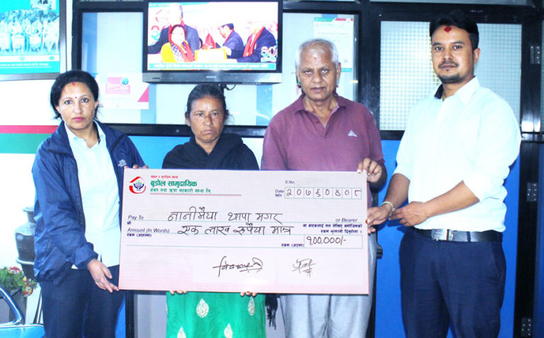 संस्थाका सचिव प्रेमनाथ शर्माले मृतककी पत्नी नानीमैयाँ थापामगरलाई बीमा बापतको रकम हस्तान्तरण गरेका थिए । संस्थाले आर्थिक सुरक्षा कार्यक्रम अन्तर्गत संस्थामा आवद्ध १६ देखि ६० वर्ष उमेर समूहका सम्पूर्ण सदस्यहरुलाई निःशुल्क रुपमा दुर्घटना बीमा सुविधा उपलब्ध गराउँदै आएको छ । यस अघि पनि संस्थाले दुर्घटनामा परी मृत्यु भएका १० जना सदस्यको परिवारलाई क्षतिपूर्ति रकम हस्तान्तरण गरिसकेको व्यवस्थापक विवेकराज ठकुरीले जानकारी दिएका छन् । संस्थाले सामाजिक उत्तरदायित्व बहन गर्दै विभिन्न कार्यक्रमहरु पनि सञ्चालन गर्दै आएको छ ।