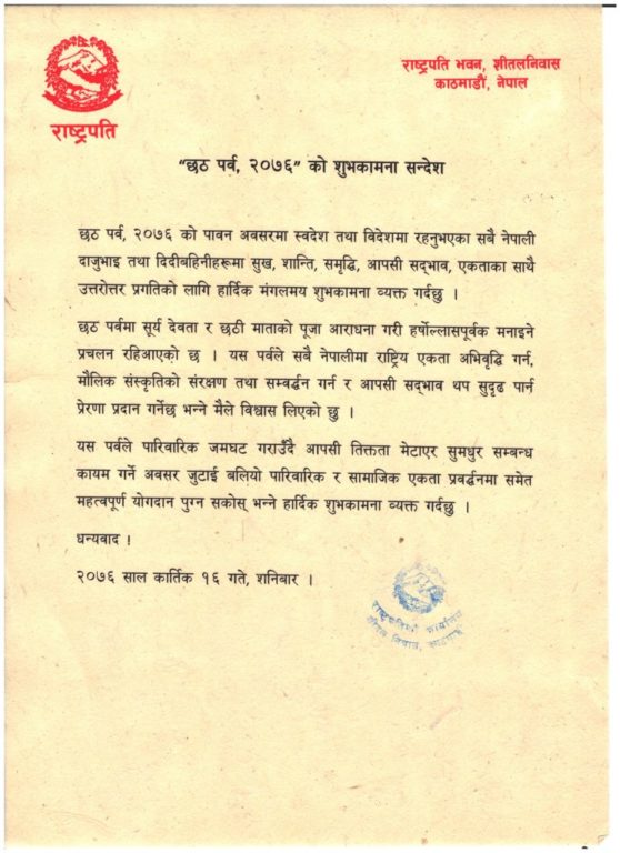 राष्ट्रपतिको शुभकामना : छठ पर्वले राष्ट्रिय एकता अभिवृद्धि हुने विश्वास