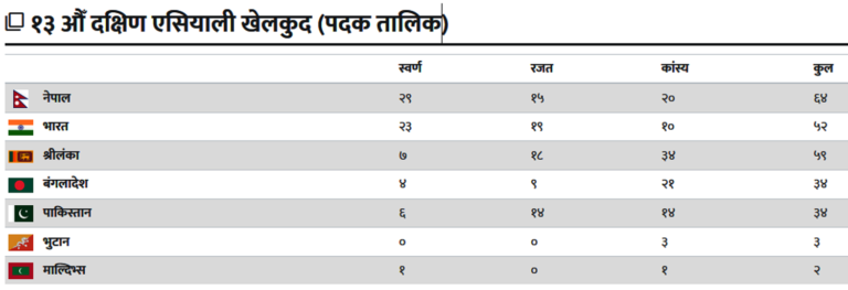 १३ औं साग २९ स्वर्ण पदकसहित नेपाल शीर्ष स्थानमै, पदक तालिका सहित प्रकाशित मिति : १८ मंसिर २०७६, बुधबार १३ औं साग पदक तालिका