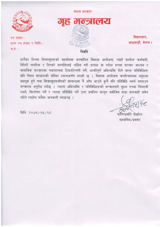 काठमाडौं । गृह मन्त्रालयले मित्र राष्ट्रहरुको सहयोगमा सञ्चालित विकास आयोजना, त्यहाँ कार्यरत कर्मचारी, विदेशी नागरिक र तीनको सम्पतीलाई लक्षित गरी नकारात्मक टिकाटिप्पणी, धम्कीपूणर् अभिव्यक्ति दिनेलाई कारवाही गर्ने चेतावनी दिएको छ ।